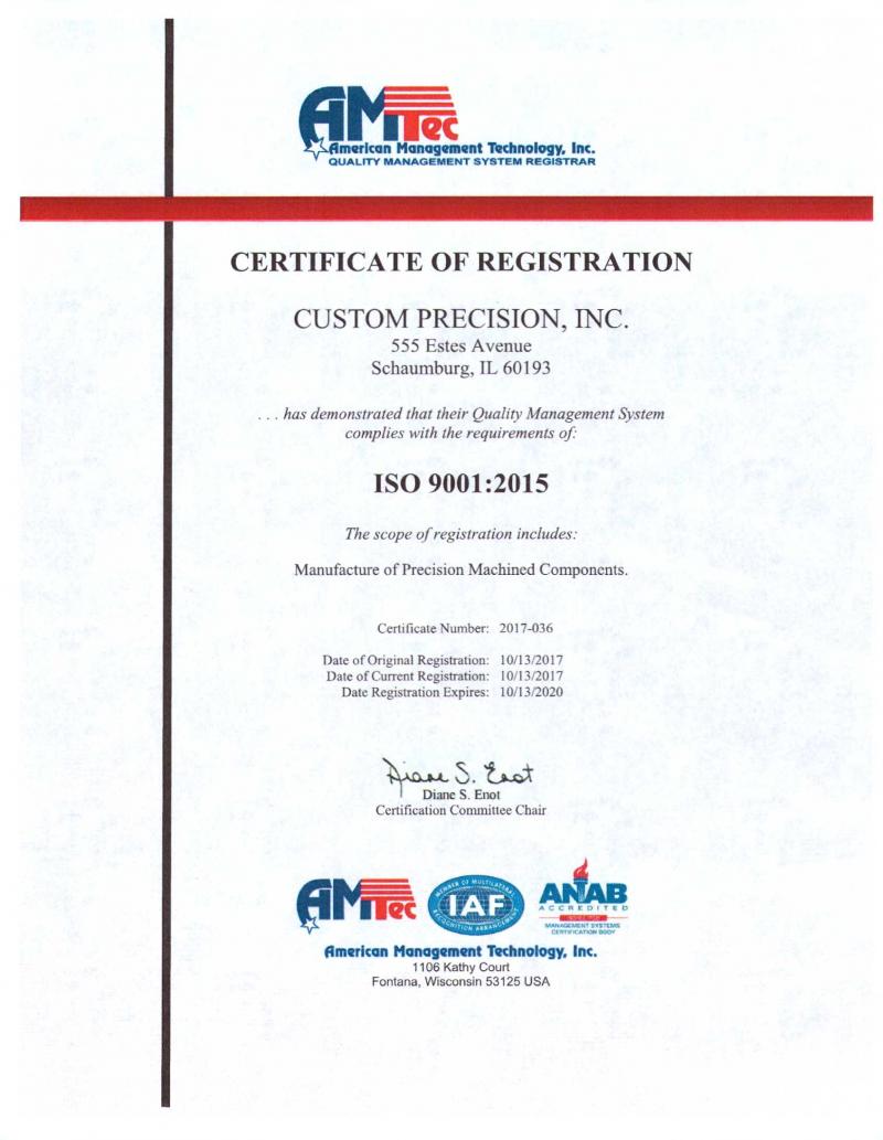 We are excited to announce that Custom Precision has become ISO 9001:2015 certified.